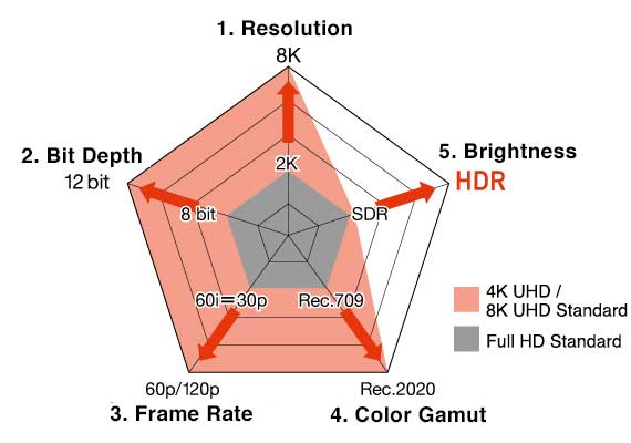 要瞭(le)解HDR的重要性要從(cóng)視頻質量的五要素說起, 這五個要素共同決定電視能呈現的内容和現實情況(或導演想要的)的程度,從(cóng)SDR到HDR這五個要素都大大提升: