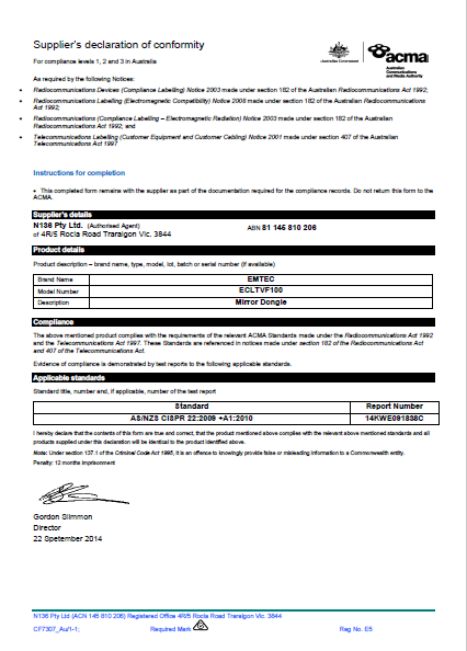 澳大利亞通訊與媒體管理局(ACMA)将現有的三種符合性标志(C-Tick、A-Tick和SAA)整合爲單一法規符合性标志RCM,該标志已於2013年3月開始實施。